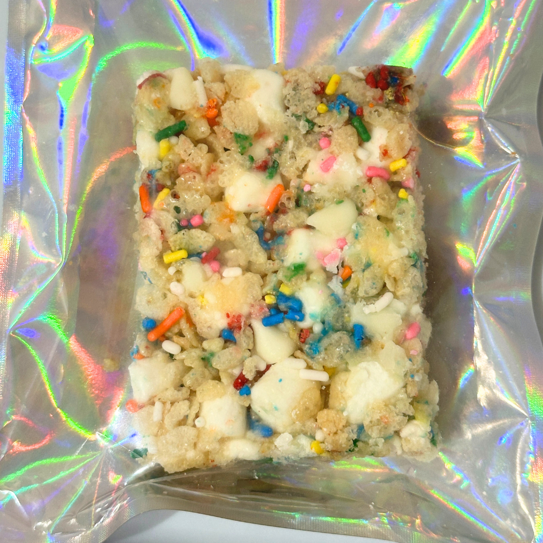 Birthday Cake Crispy Rice Treats combine classic dessert flavor with a fun, nostalgic twist. Soft and chewy with a generous marshmallow base, these treats are finished with colorful rainbow sprinkles for a sweet, celebratory bite. Each treat is infused with 100mg of Delta-9 THC made with Nano D9, which is designed to deliver faster onset and longer-lasting effects.
